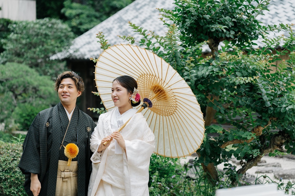 春日庵、奥殿陣屋、岡崎城、丈山苑などの日本庭園で和装撮影を、スタジオ内で洋装撮影をするプランです◎