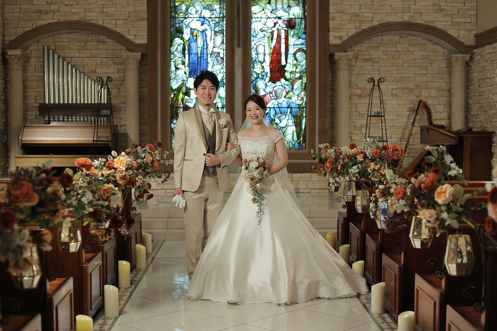 アンティーク調でブラウンが基調となっているチャペルの中で、白やベージュのお衣裳はとても映えますね☆彡