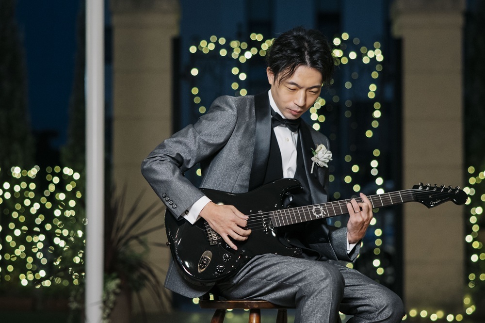 グレーのタキシードやイルミネーション、そしてブラックのギターでとってもシックなかっこいい雰囲気の1枚に°˖✧