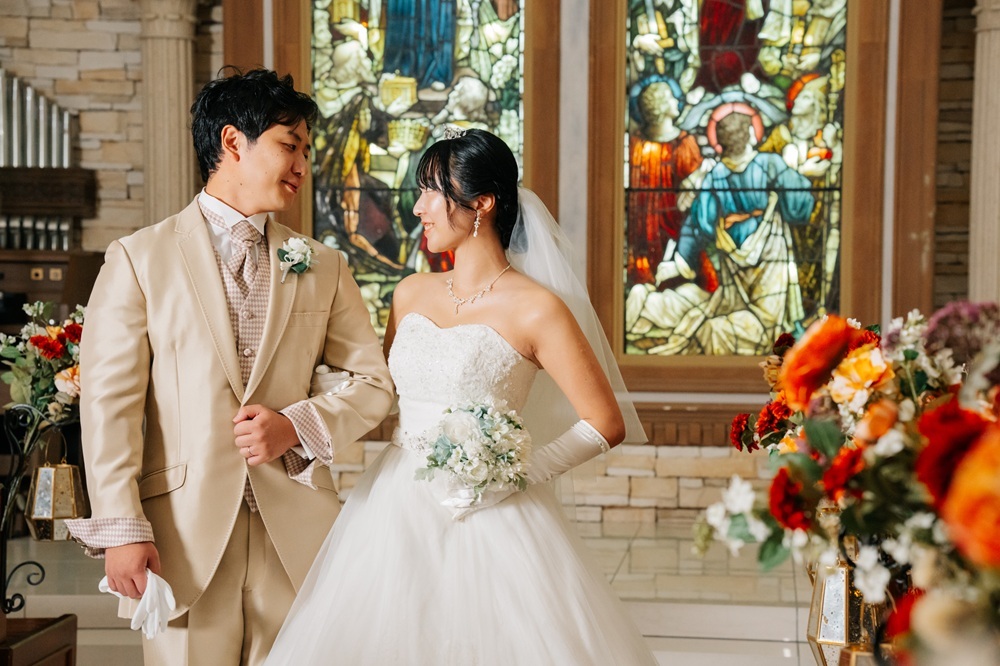本物のチャペルだからこそ、バージンロードのお花など、奥行き感を出したお写真を撮ることができます!