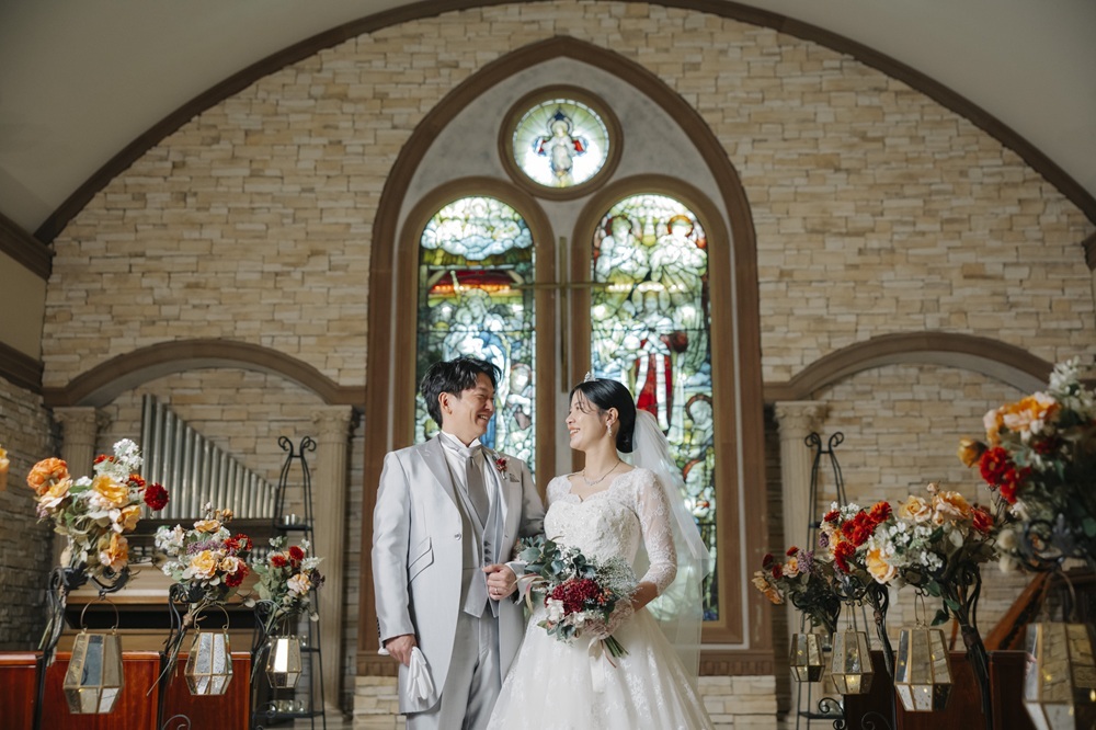 バージンロードのお花やえんじ色の椅子など、チャペル内はアンティーク調になっています。