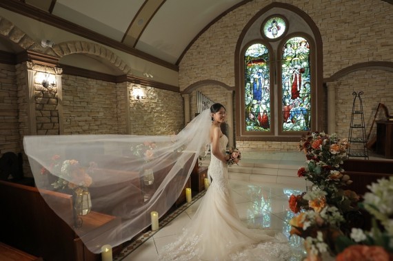 ・ステンドグラスの前でベールがなびいているような、ベールショットはマスト!